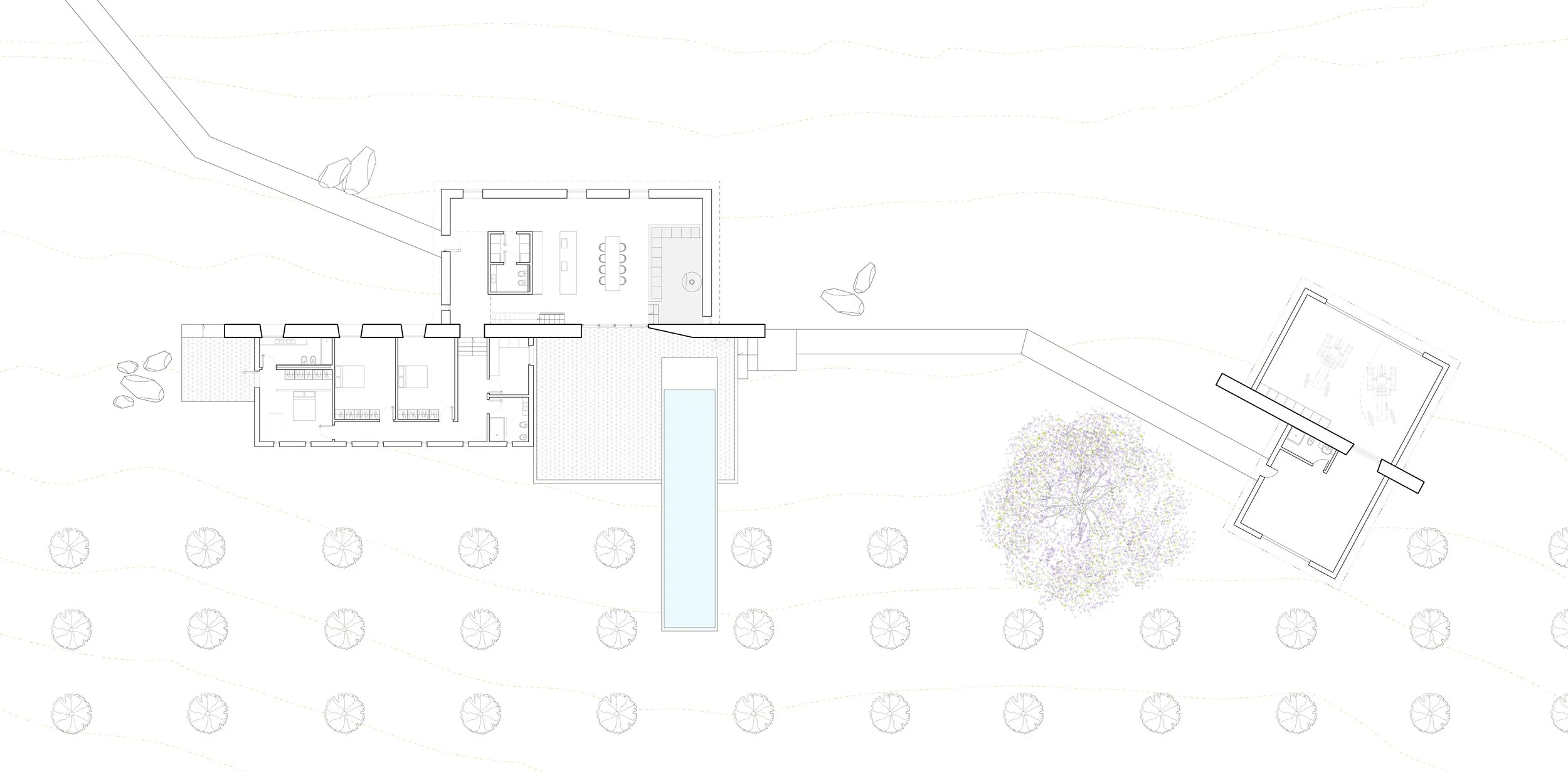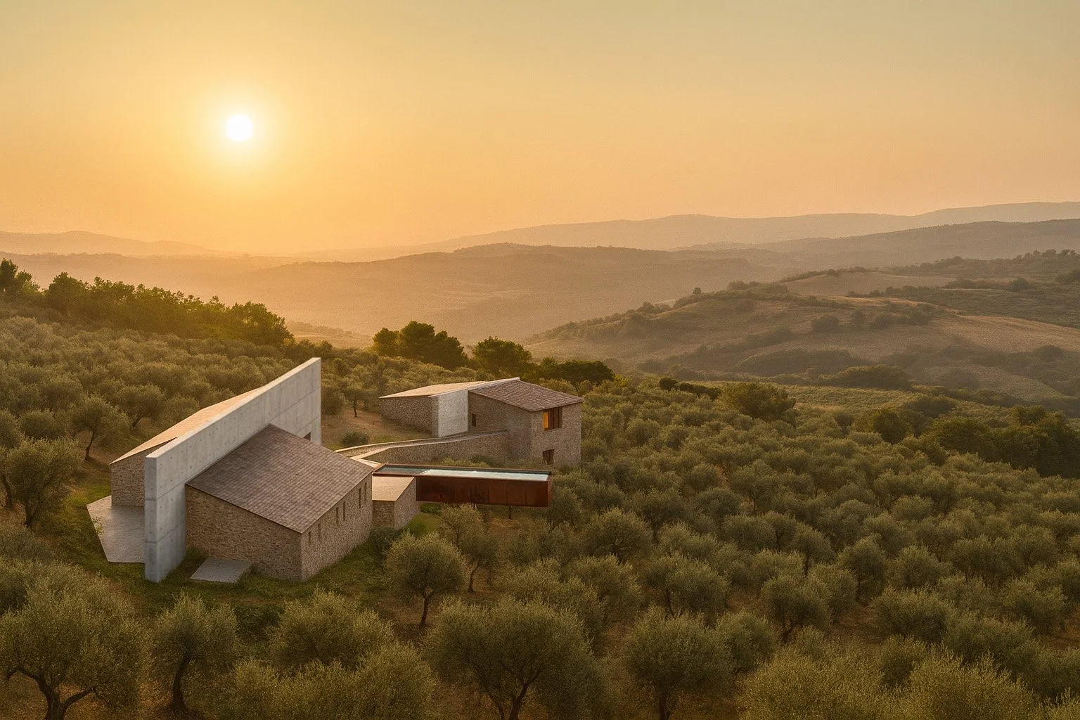 This intuitive strategy is paired with a more rigorous method of site measurement, expressed through the presence of a permeable wall—an homage toCostantino Nivola’smuro con albero. This linear element organizes the project, separates the farm from the farmer’s house, and unfolds into a series of architectural devices. From it extend secondary functions, such as the swimming pool and the panoramic platform, which integrate into the landscape as extensions of the terrain itself.