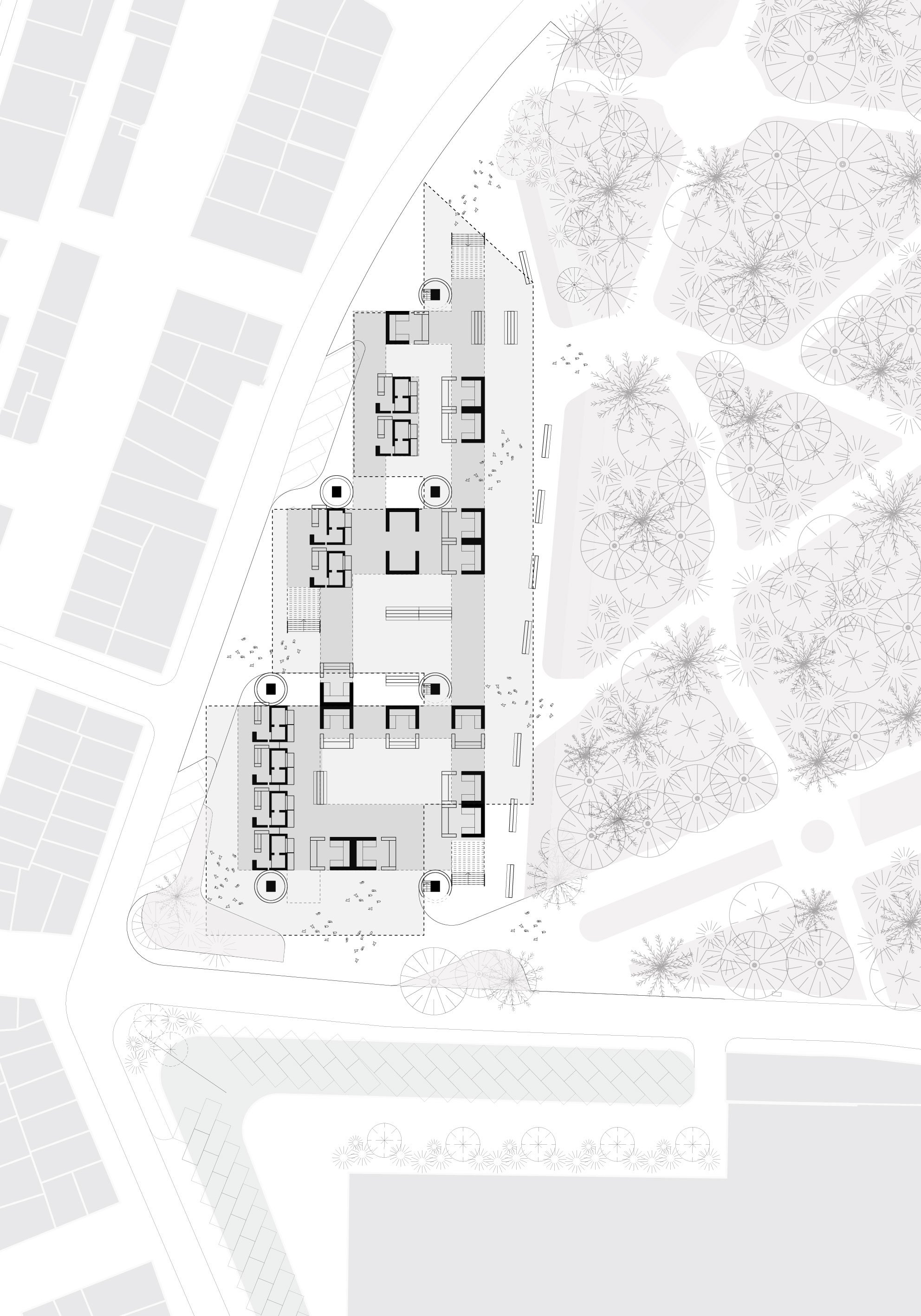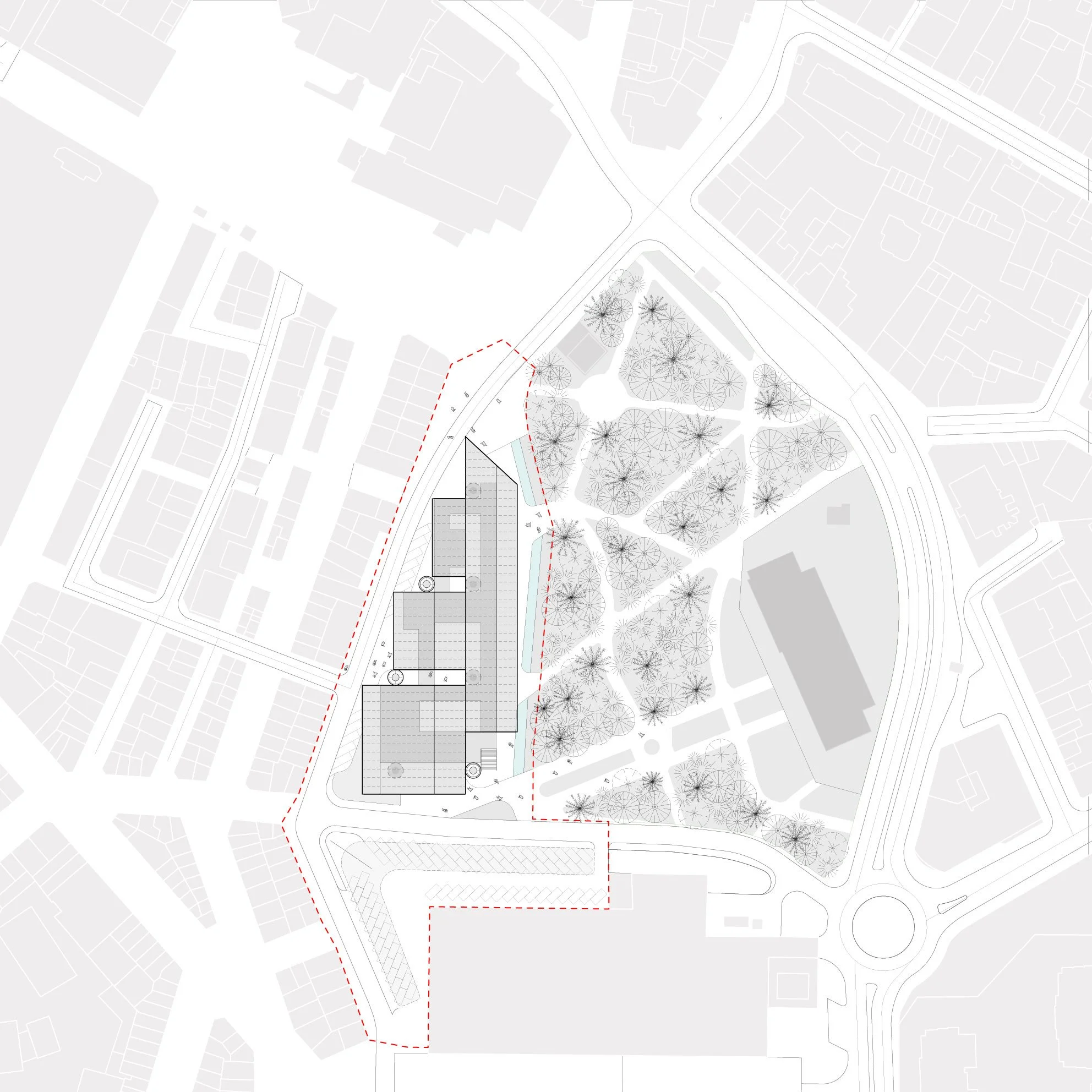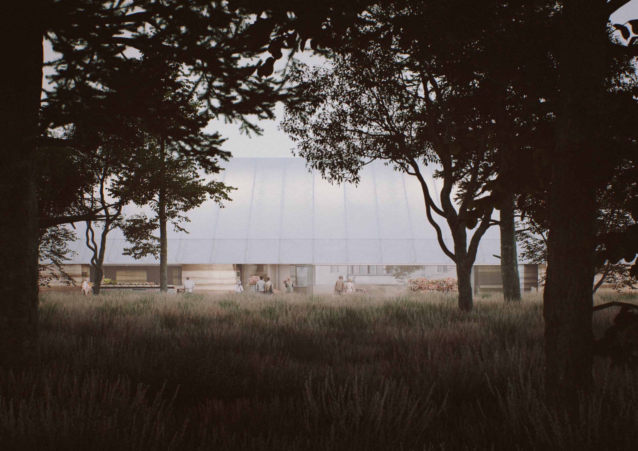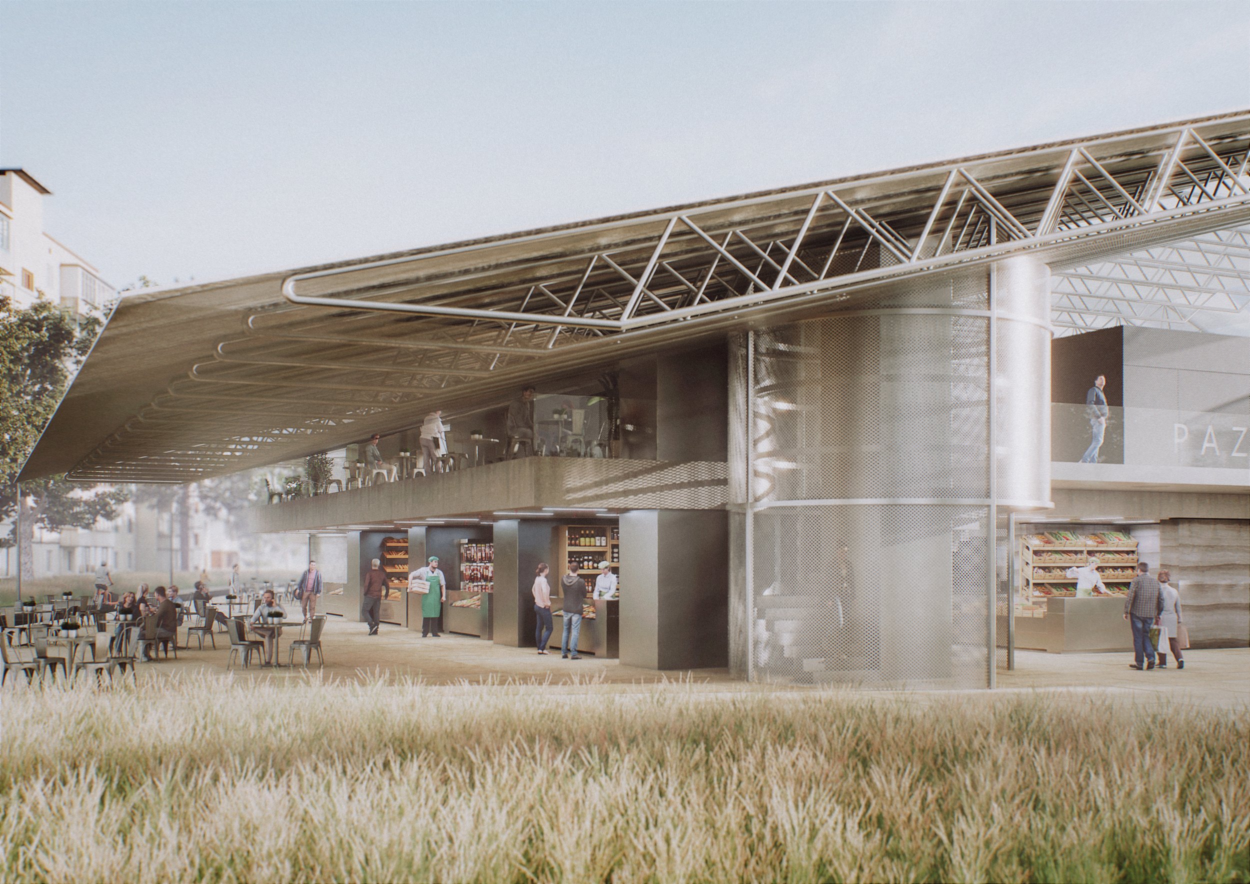 The site's adjacency to the park and the historic Mineral Bath building was a key driver in shaping the design. On the eastern edge, a soft transition zone of vegetation and water blurs the boundary between the market and the park, maintaining a strong visual and physical connection. Restored pedestrian pathways lead into generous open areas within the market, envisioned as flexible zones for cultural, social, and community events.