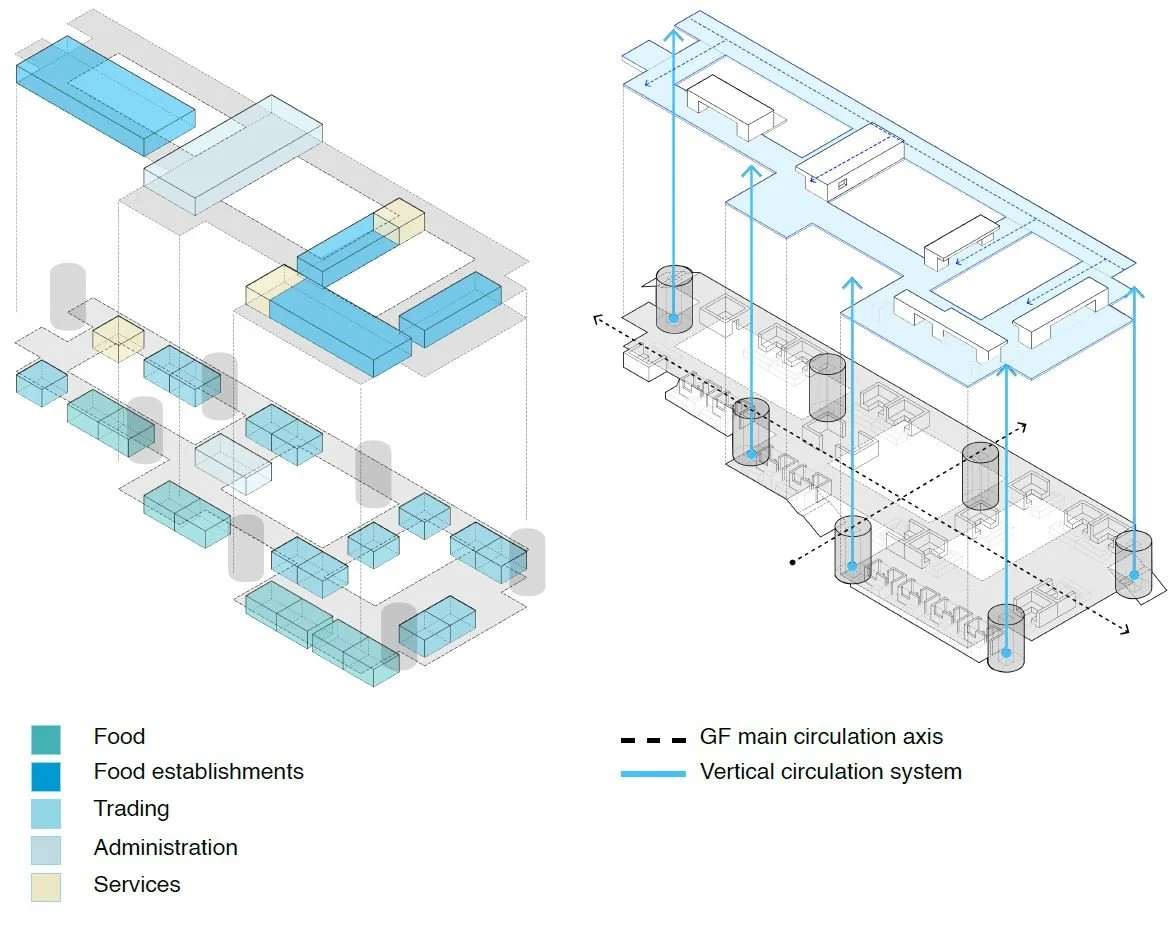 The Market spans the Ground Floor and Level 1, raised at +4m. On the Ground Floor, it adapts to the site’s features: the west side hosts food stalls and seating, linking to the surrounding built environment and remaining active beyond Market hours, while the east side opens toward the Park, offering larger spaces for social and public interaction. Administration and security are centrally located in the plaza, extended vertically to Level 1, which becomes the open air terrace with seating and dining areas for the F&B units.